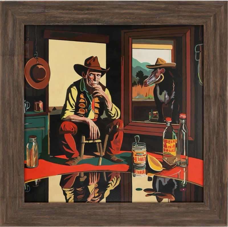 In response to Ed Ruscha's iconic word paintings, this artwork ingeniously employs transparency, subverting Ruscha's emphasis on text by rendering it invisible. Through this clever riposte, the artist challenges conventional notions of language's dominance in art, inviting viewers to contemplate the interplay between visibility and invisibility, languageand aesthetics. The result is a mesmerizing fusion of conceptual depth and aesthetic pleasure, where the absence of text paradoxically speaks volumes, inviting interpretation and engagement on multiple levels.